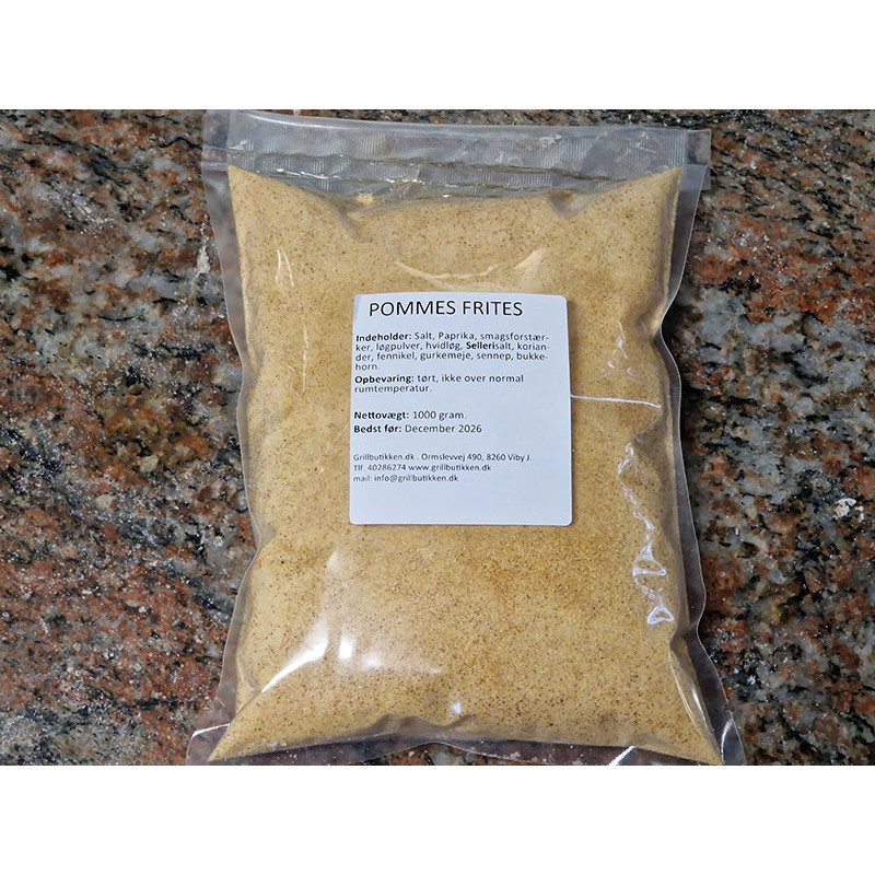 Ingredienser: Salt, Paprika, smagsforstærker, løgpulver, hvidløg, Sellerisalt, koriander, fennikel, gurkemeje, sennep, bukkehorn